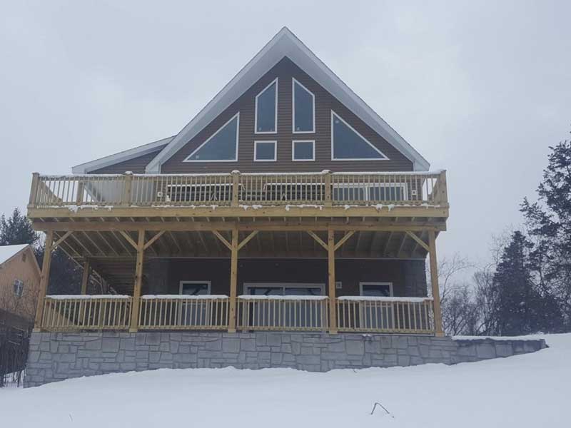 Our Chalet Home Model features a retaining wall, prow roof, a wrap-around porch and deck combo, brick wall front on the walk-out basement, finished with beautiful cedar siding.